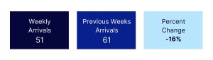This week brought sharp declines across most vessel categories. Container traffic fell 18%, tanker arrivals dropped 25%, and tug/ATB were down 67%. No general cargo vessels called this week, while bulker and Ro/Ro traffic were the only segments to see an increase.